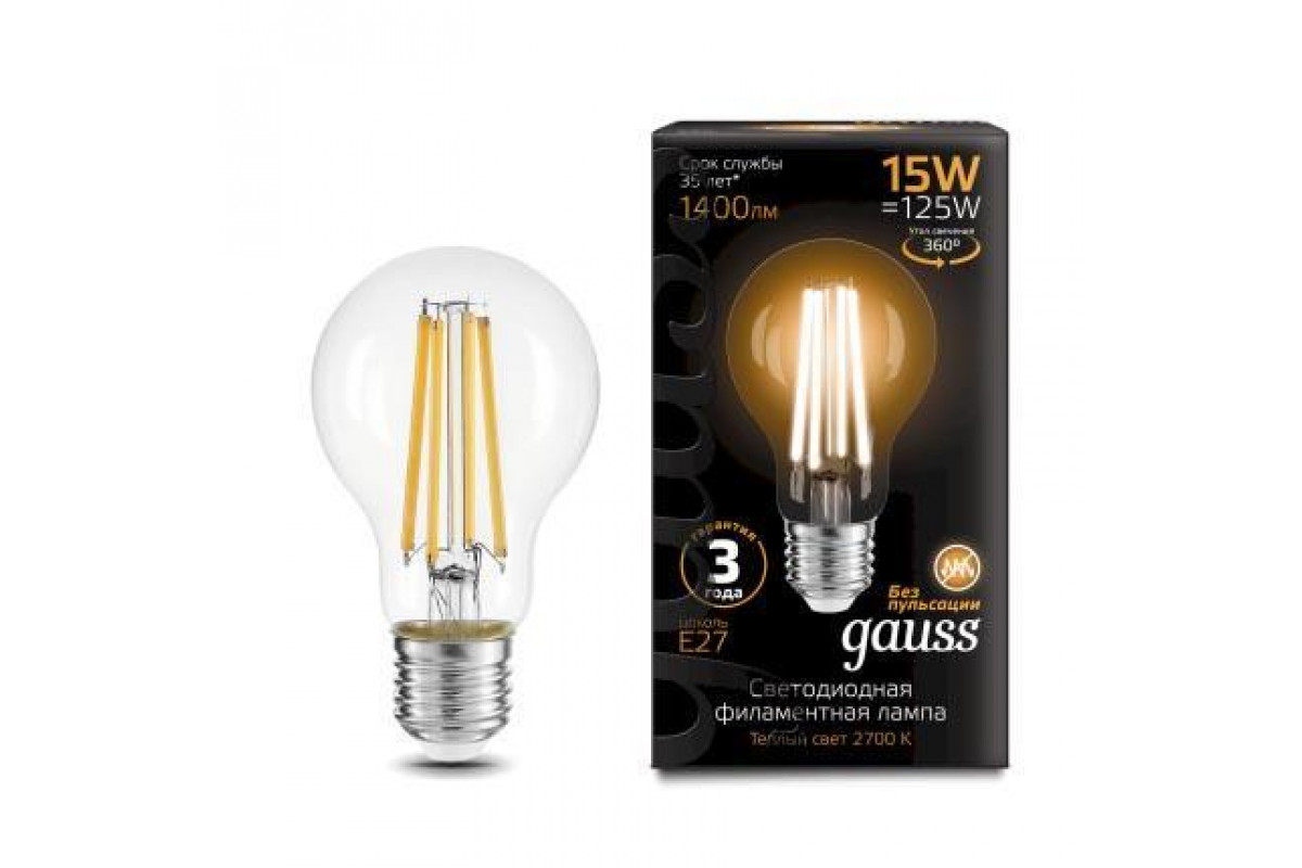 60Лампа светодиодная филаментная Gauss E27 15W 2700K груша прозрачная 102902115 по цене 549 руб. от бренда Gauss в категории Филаментные лампы